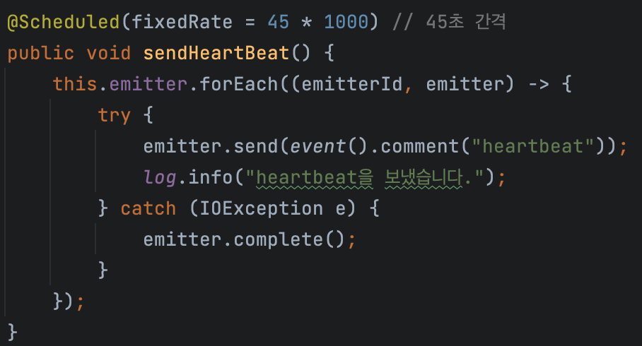 그래서 이렇게, 45초 간격으로 살아있음을 알려주는 heartBeat를 보내서 연결을 유지했다. 물룐이 연결은 SseEmitter 객체의 timeout시간이 되면 소멸한다. 하지만 곧바로 재요청을 보내도록 되어있어 다시 알림을 수신할 수 있다.