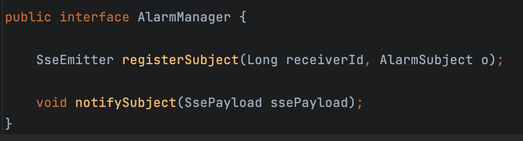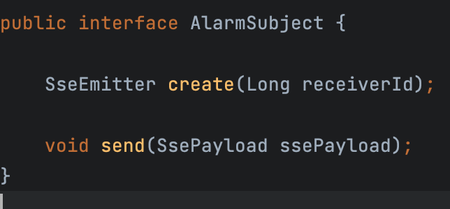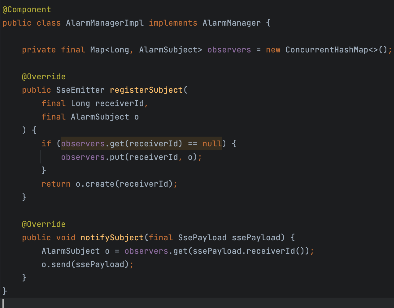 눈여겨볼점은 Map형태로 AlarmSubject인터페이스를 가지고 있다는 점이다. 저기에서 해당하는 관찰자를 찾고, 그 관찰자가 알림을 전송하도록 역할을 위임하는 점이 옵저버 디자인 패턴의 핵심이다.