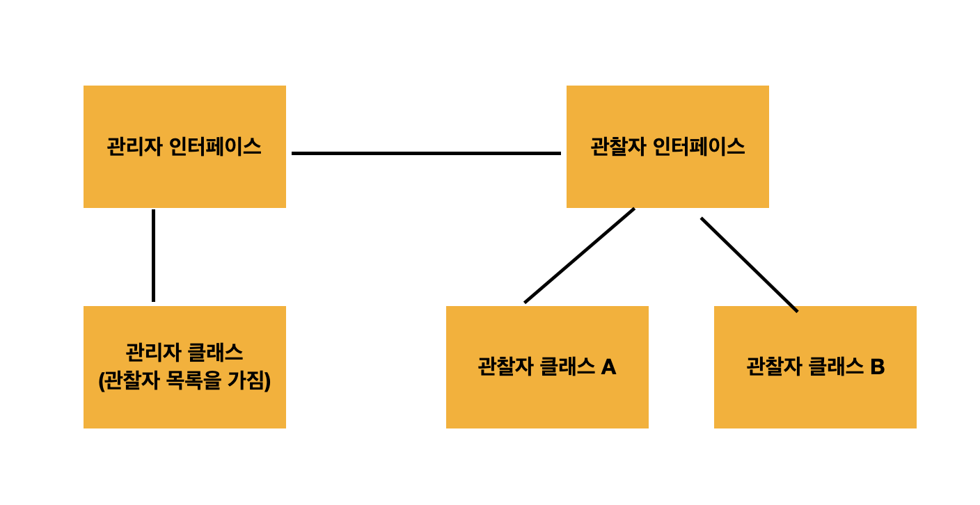인터페이스로 관찰자를 등록하는 메소드, 관찰자에게 알림을 전송하라는 의미의 메소드를 사용했다.