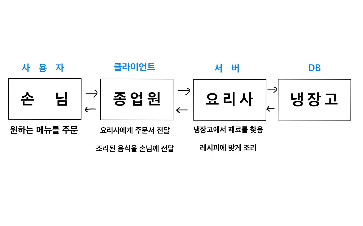 여기서 서버는 요리사, 서비스는 주문서, 클라이언트는 종업원을 의미합니다.